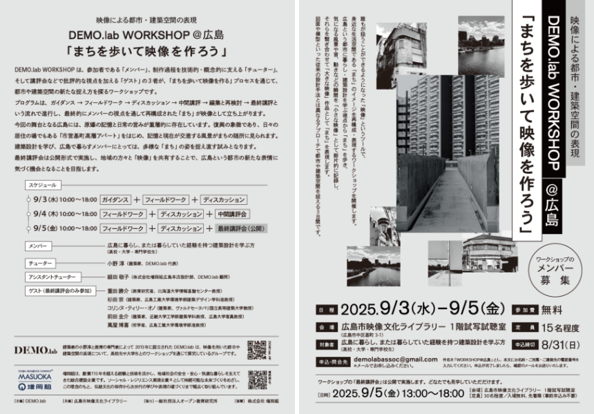 当社が協賛したDEMO.lab WORKSHOP@広島「まちを歩いて映像を作ろう」のイベントが2025年9月3日(水)~5日(金)に開催されます。イベントでは、建築設計を学ぶ高校生や大学生、専門学校生が広島のまちを歩いて写真や動画でその断片を切り取るフィールドワークと、そこで集められた映像についてのディスカッションを繰り返すことによって、自分のまちについての考察がどのように映像につながるのかを確認していきます。参加者は、各々一つずつ映像作品を作り、最終的には参加者が表現した“まち”が映しだされていきます。