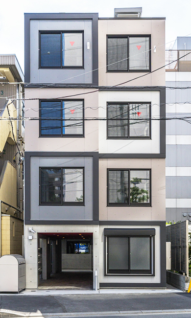 MajesticLife品川は、京浜急行青物横丁駅から徒歩6分、大きな道路の向かいには鮫洲運動公園もあり、明るい都心の中にあります。外観は黒のフレームに、グレー・ステンカラーのブロックを積み重ねたようなポップな雰囲気となっております。内部は白の基調に、濃い木目を合わせたすっきりとした雰囲気にまとめています。ピロティの赤い天井が、外観の雰囲気をより楽しく、ポップに後押しするアクセントになっています。