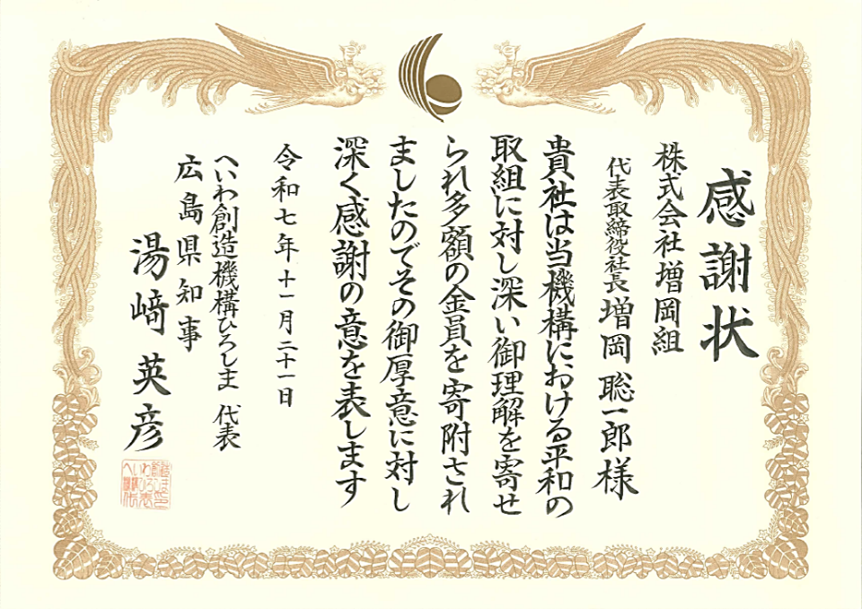 当社は、1908年に広島で創業し、戦後復興活動のほか、“ソーシャル・レジリエンス実現企業Ⓡ”として災害復旧対応など、地元広島に根差した総合建設業として歩んできました。このたび被爆・終戦80年の節目に設立された「一般社団法人へいわ創造機構ひろしま(HOPe)」(注1)の核兵器のない平和な世界の実現に向けた取り組みに強く賛同し、活動を支援するために寄付を行いました。