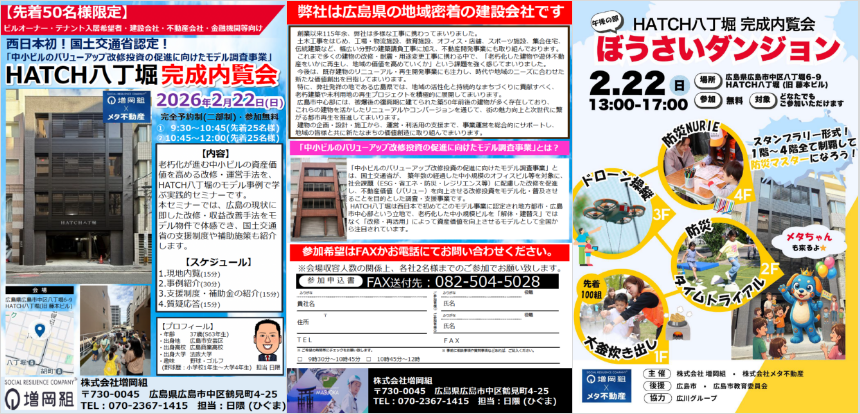 また同日午後には、一般の方もご参加いただける防災体験イベント「ぼうさいダンジョン」を同時開催します。老朽化ビルの再生と、防災体験を通じた地域への開放を組み合わせた、新たな取り組みです。