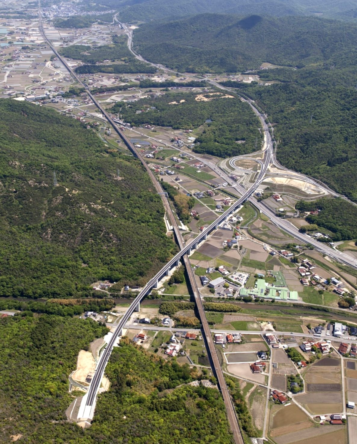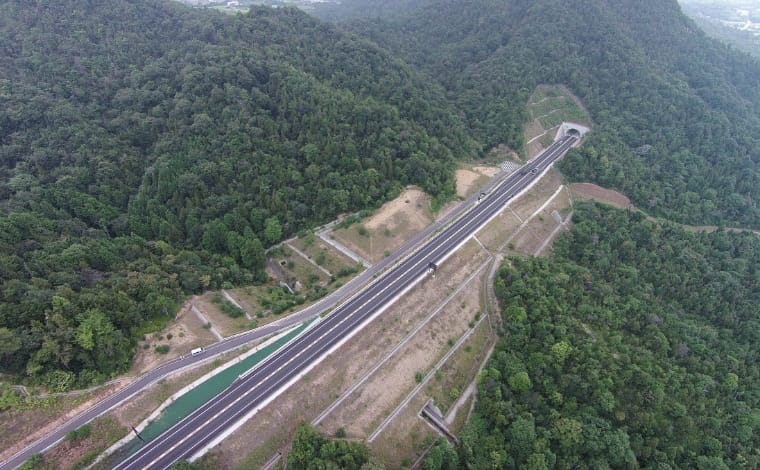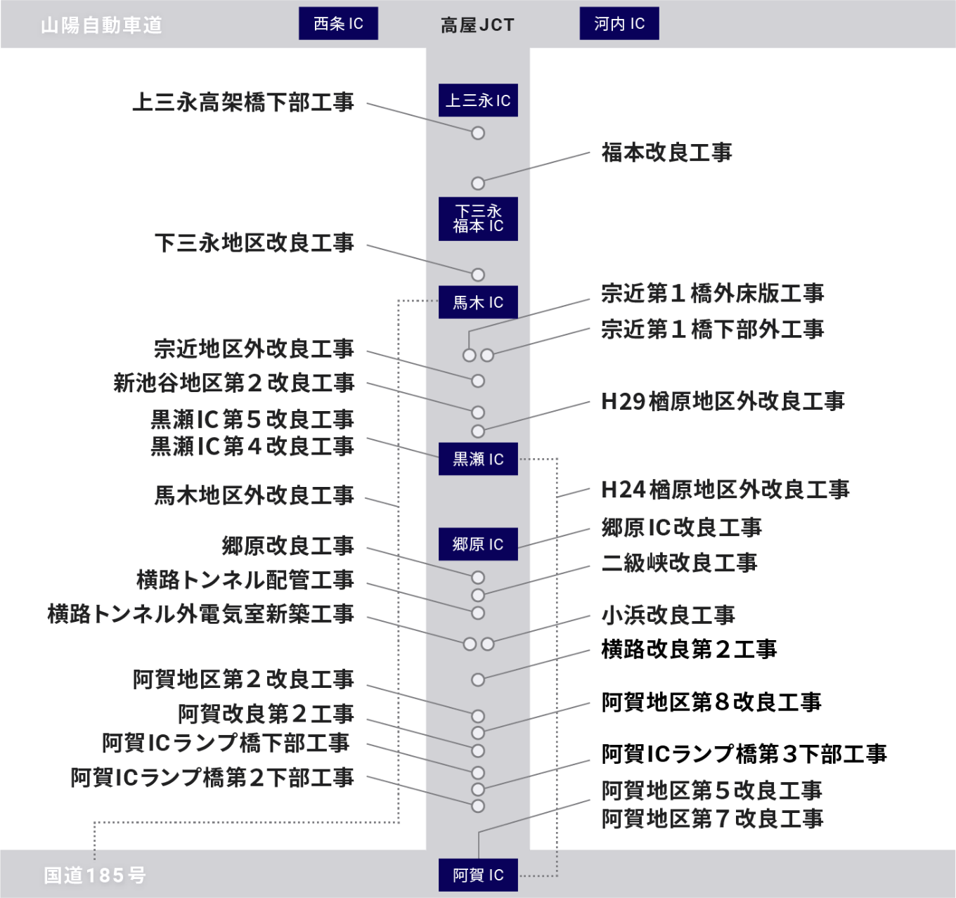 その東広島・呉自動車道が、平成27年3月15日に延長32.8kmが全線開通、また、令和4年3月19日に阿賀立体化が完成しました。弊社はそのうち、道路改良19工事、橋梁下部5工事、床版工事、トンネル配管工事、電気室新築工事の27工事を担当いたしました。